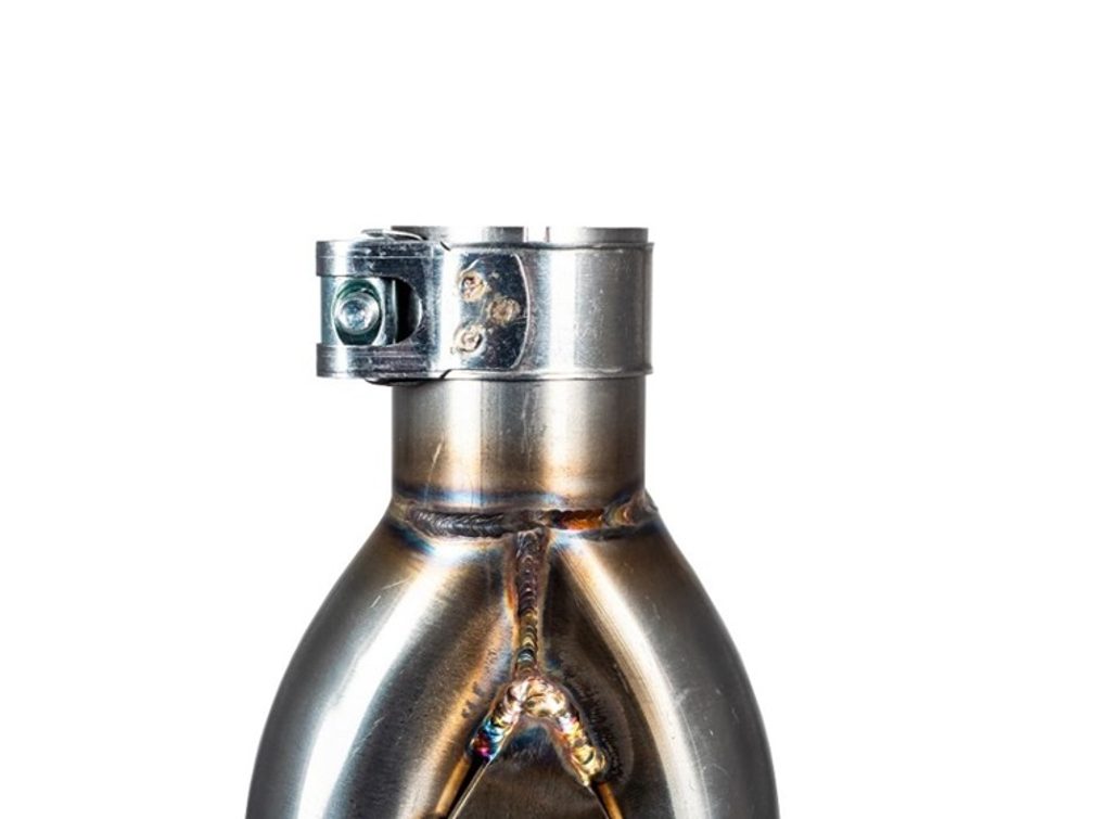 The F205 features a special double "horn" gas exit. It is made of 304 stainless steel, with visible TIG welding.