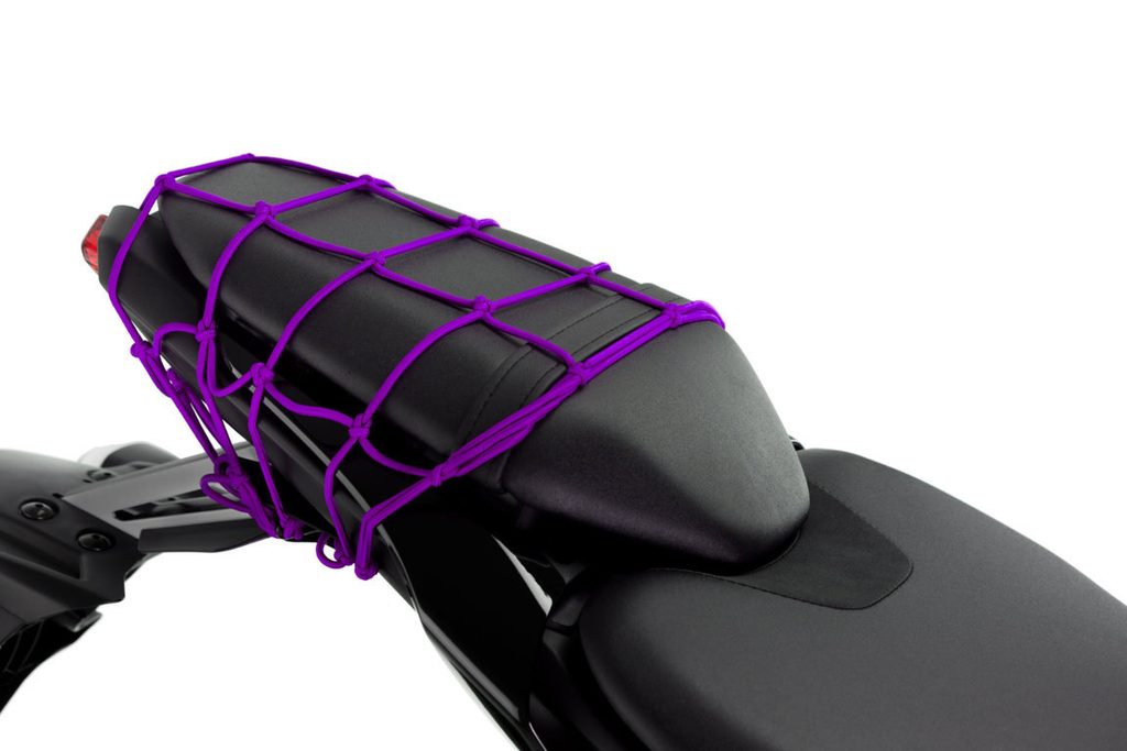 Purple elastic motorcycle net is the perfect accessory for punctual or usual load needs of a biker. Available in measures 350 mm x 350 mm, they are manufactured with a material of high elasticity and strength, which gives them a great capacity to adapt to the shapes of all types of packages and support a high weight. They have numerous metal hooks, lined in plastic material so as not to scratch the motorcycle, which allow the net to be fastened quickly and safely move objects in the back