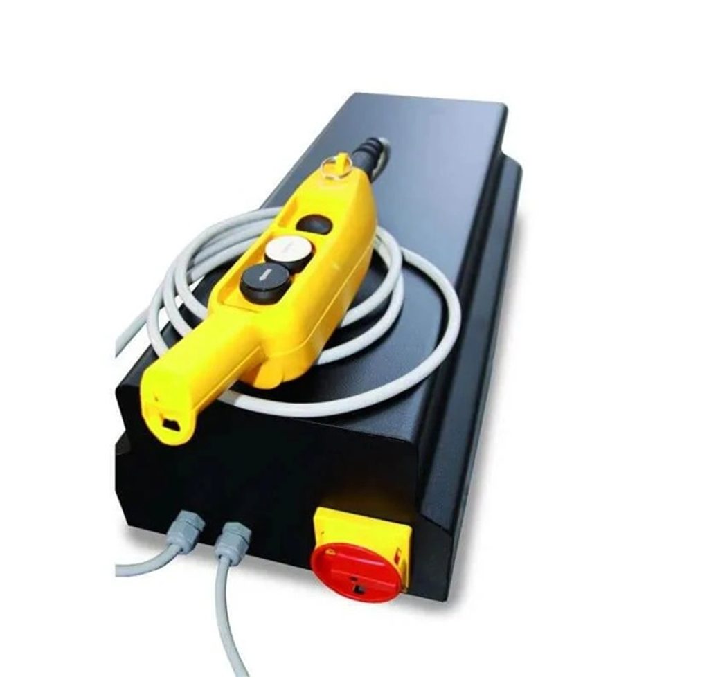 Our LV8 Goldrake motorcycle lifts are supplied with a control unit, integrated into the base, protected by a powder coated sheet-metal cabinet with interlocked safety switch and a button panel equipped with magnet.