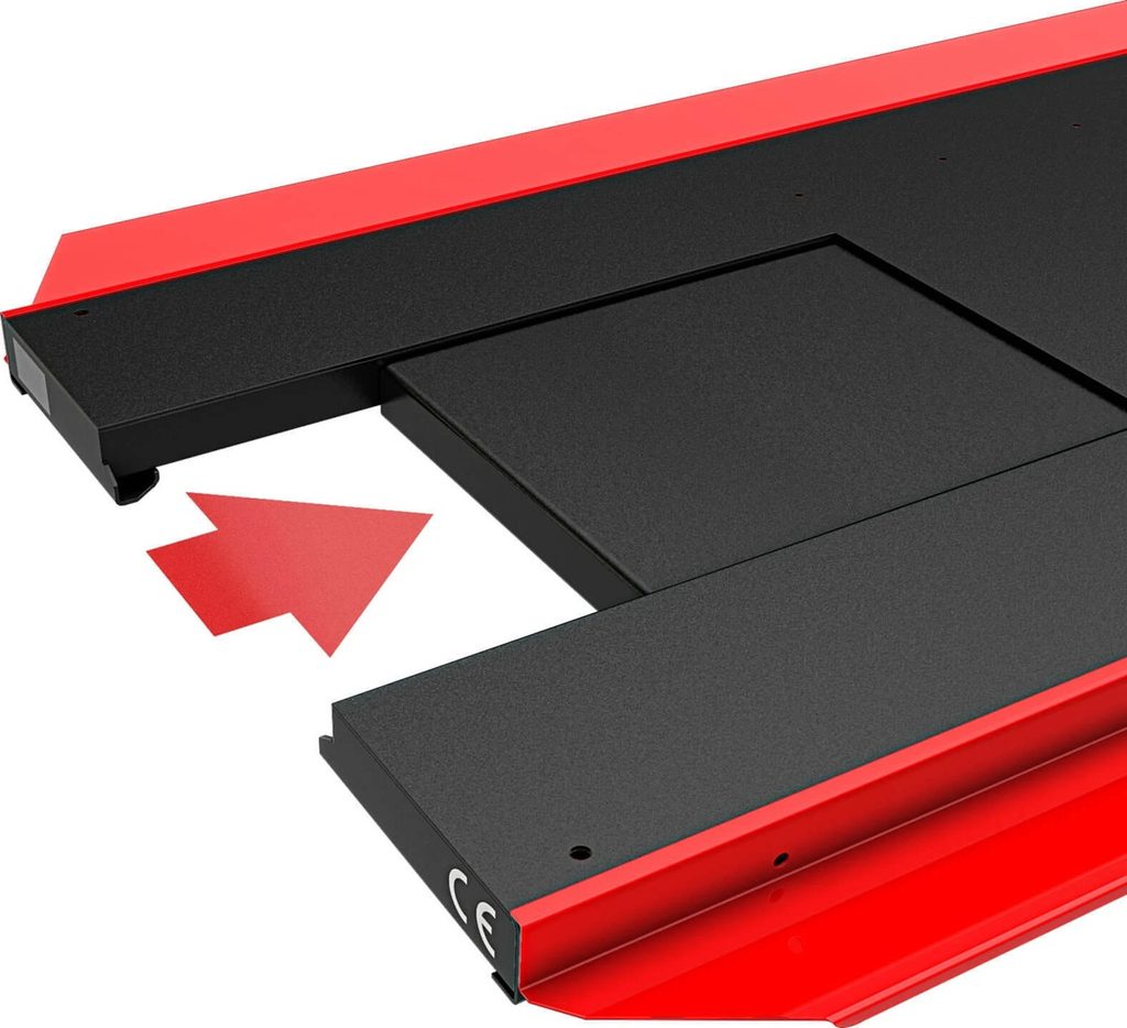 The platform of the LV8 NANO motorcycle lift is provided with removable gate to facilitate the demounting of motorbikes rear wheels and it is equipped with set-up for fitting wheel clamps, front extensions, ratchet tie downs and antiskid central covers.