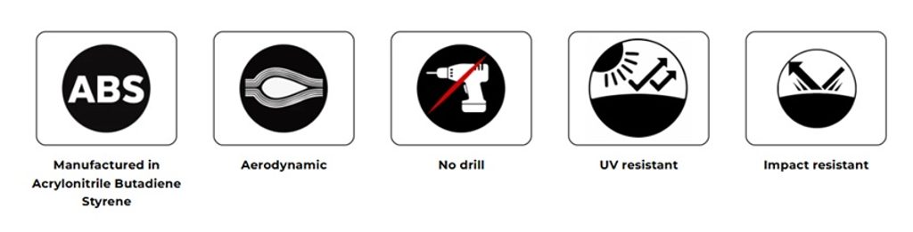 It is available in a matte black finish. Made from 3 mm thick technical ABS, it combines lightness and strength. Its dimensions are 315 mm wide, 350 mm long, and 124 mm high.