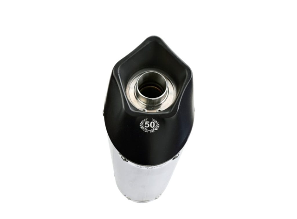 GPR's New Grand Prix Evo Titanium - the Silencer is conical, with a special shape starting from a diameter 90mm to arriva at 130mm of circonference and lenght that depend from the motorbike of destination. It has a sleever made in titanium realized with natural color, black endcap made through CNC machining with pentagonal exit and dbkiller.