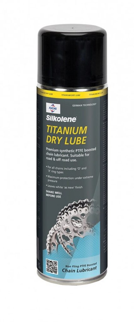 Ensure chain is clean and dry prior to applying SILKOLENE TITANIUM DRY LUBE. We strongly recommend the use of Silkolene Brake and Chain Cleaner prior to use. Shake can well before application. Apply sparingly to the whole length of the inside of a clean warm chain. Leave for a period of time (ideally a few hours) before use. Wipe away excess. Following application invert the can and spray for a few seconds to avoid clogging the nozzle.